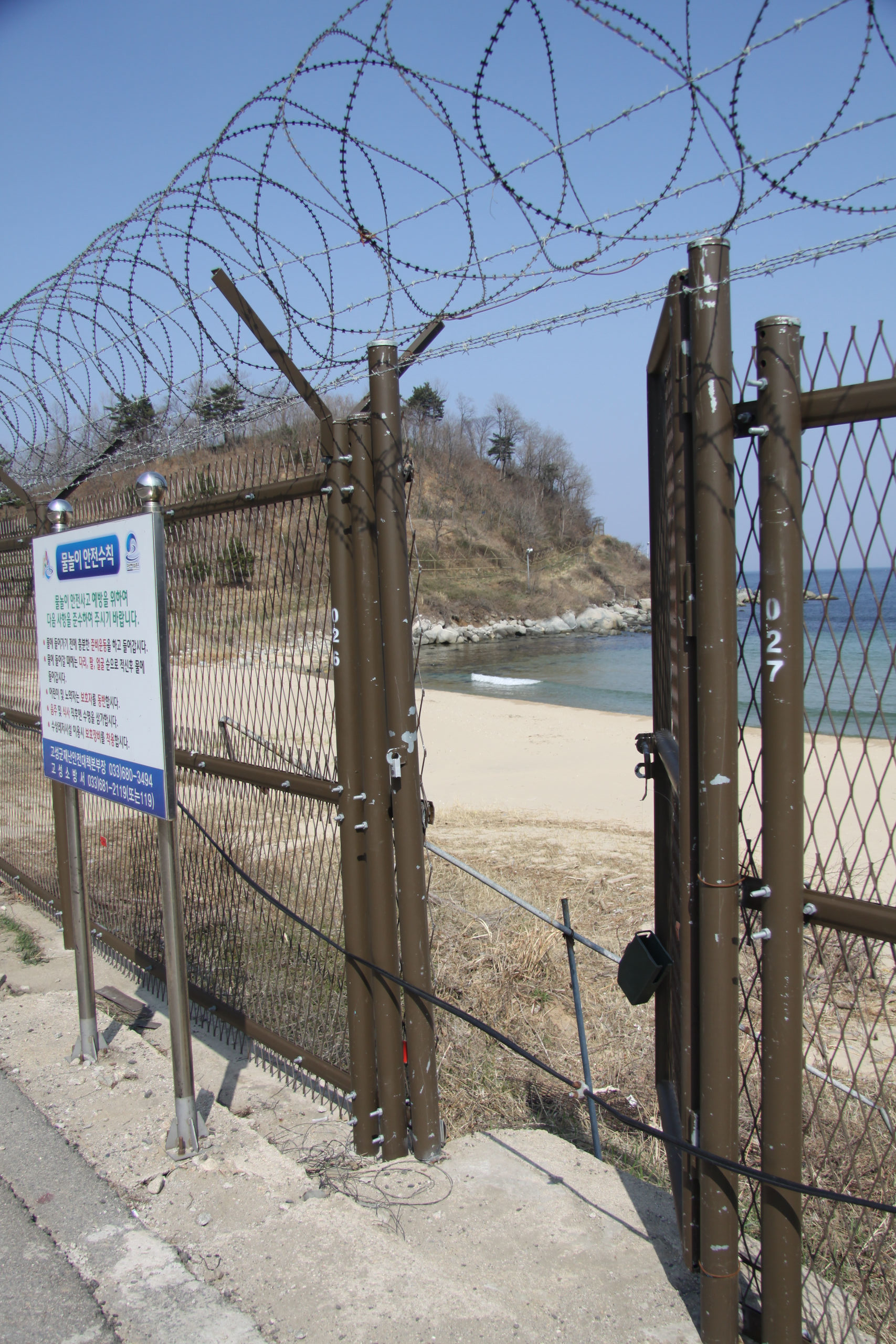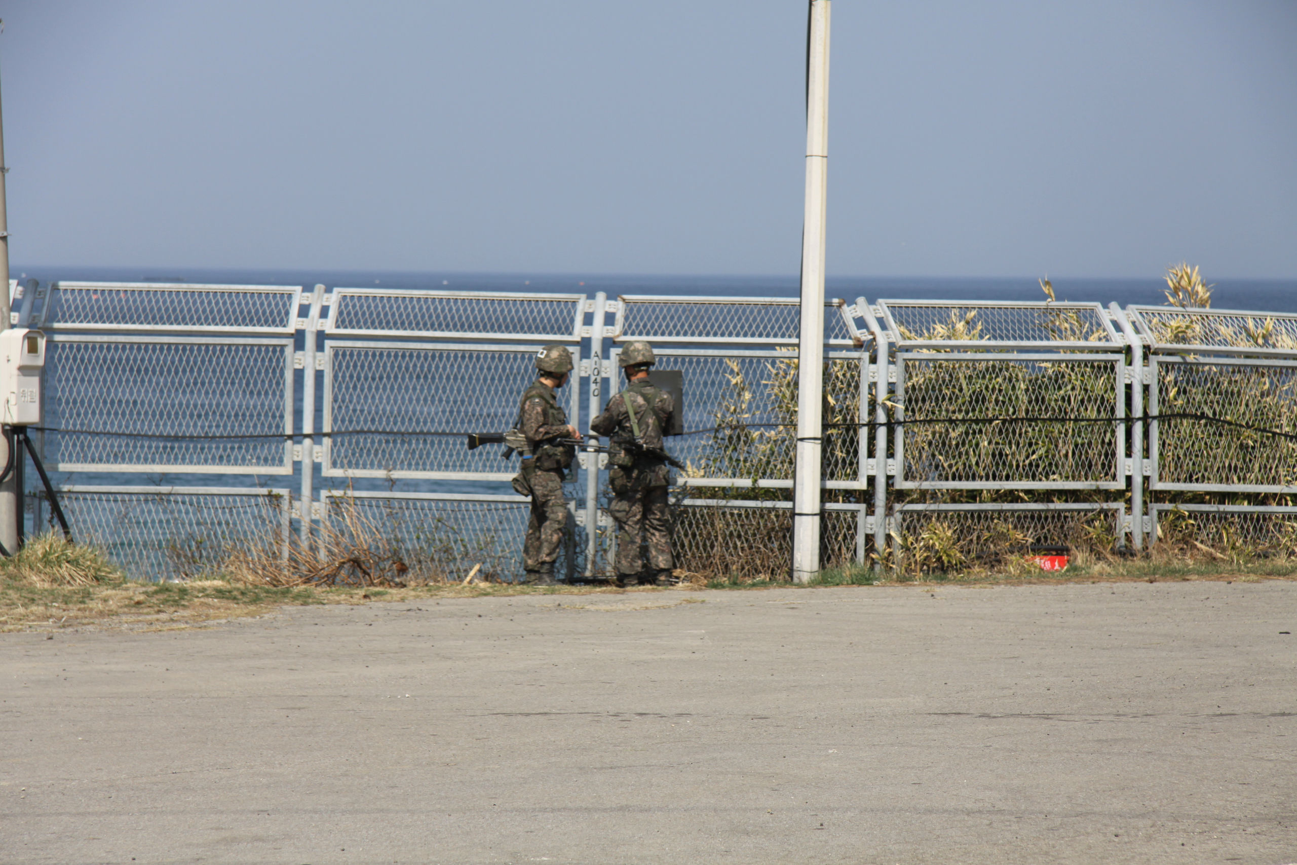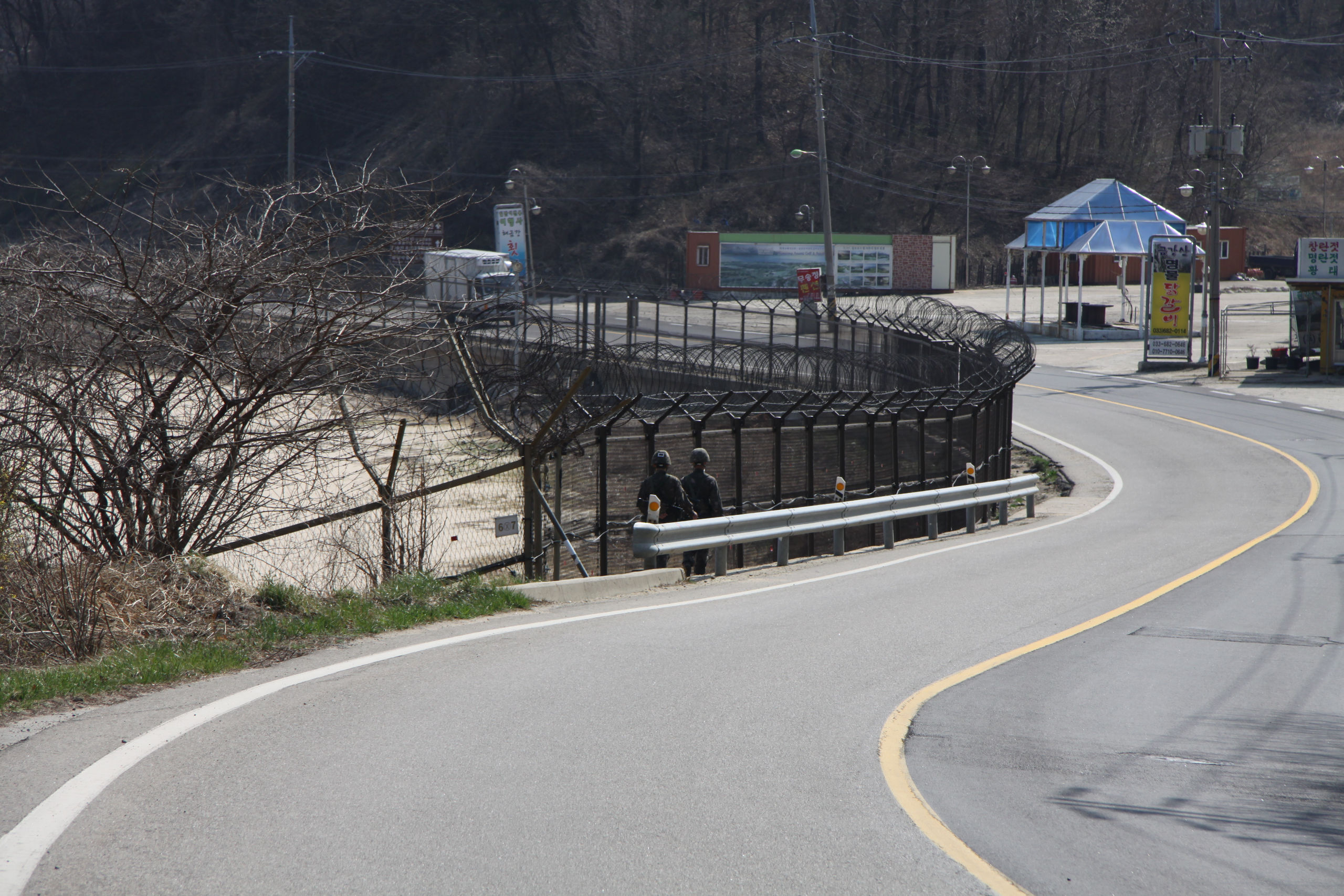 Обрытная дорога, проезд через КПП — все на месте, и мои корейские друзья высадили меня у пункта регистрации. По дороге до автобусной остановки увидел военный патруль, охраняющий забор.