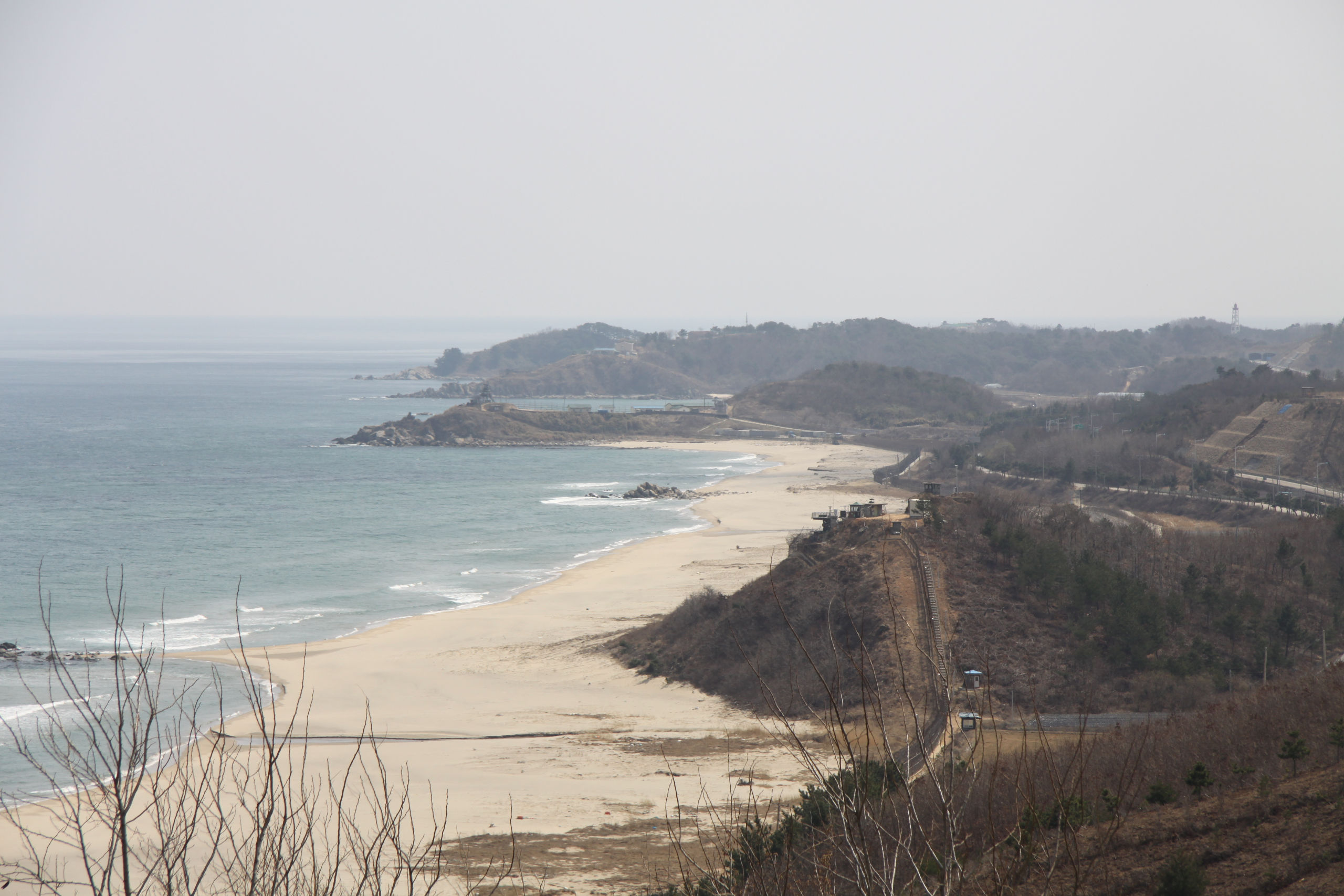 Вот так выглядит южно-корейская сторона со смотровой площадки. Вдоль побережья тянется забор.