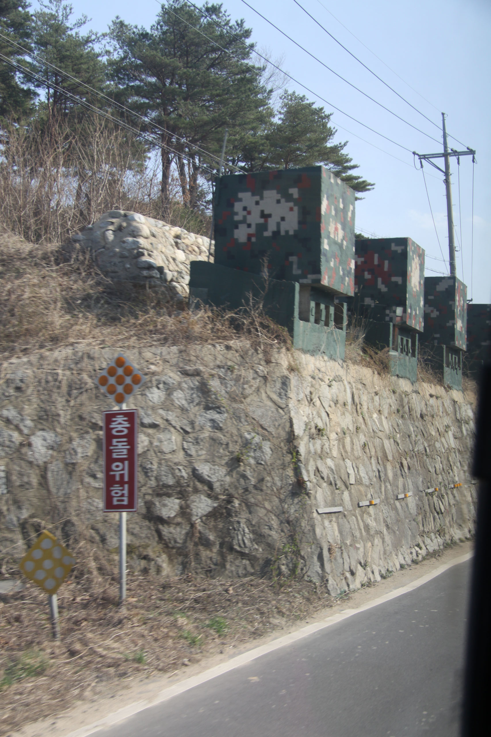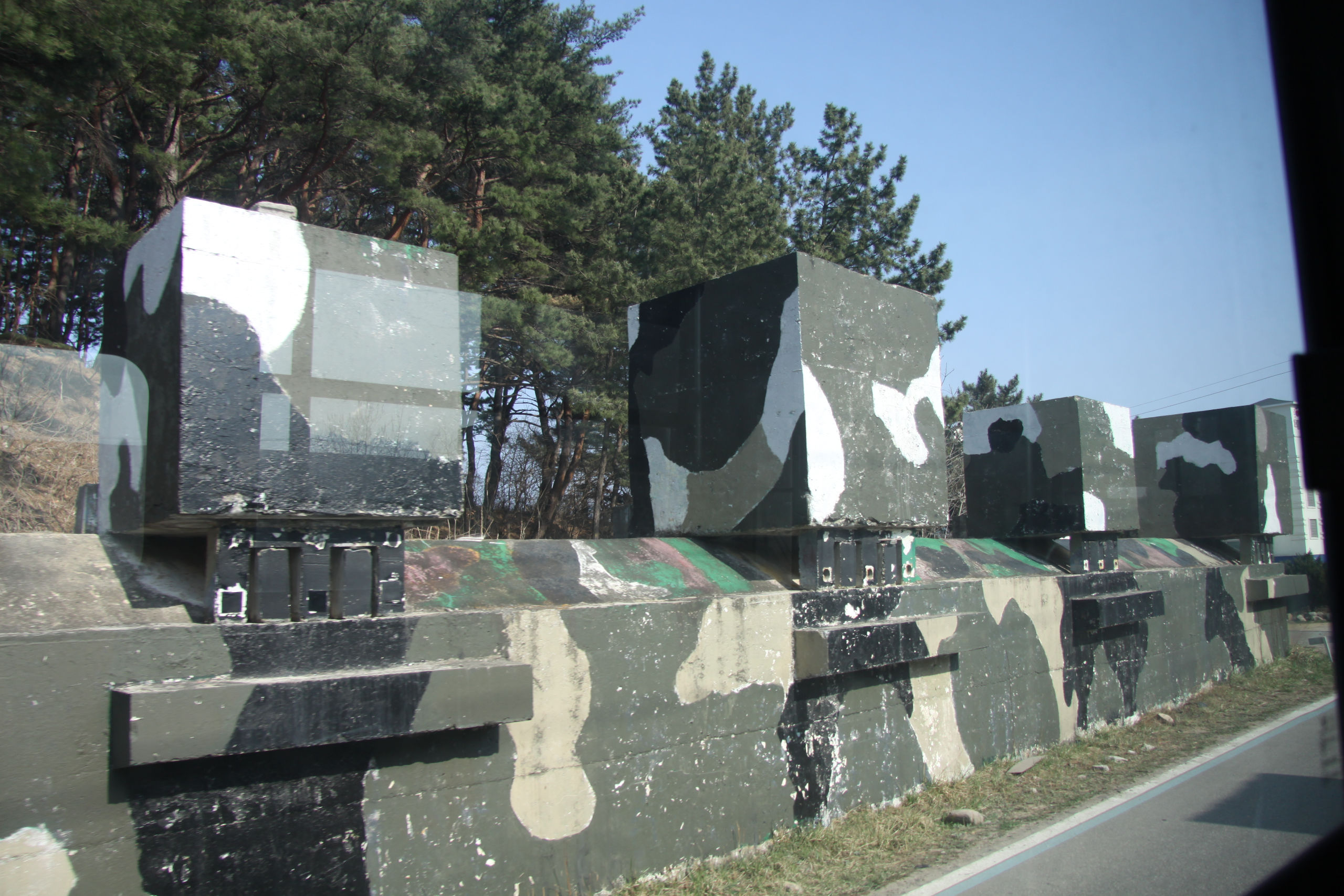 Напоследок, несмотря на то что Южная Корея демонстрирует готовность, как минимум, к дружбе, безопасность остаётся превыше всего. По дороге к ДМЗ (даже на городском автобусе) проезжали достаточно много таких вот заграждений. В случае чего, блоке опускаются вниз и становятся серьёзным препятствием.
